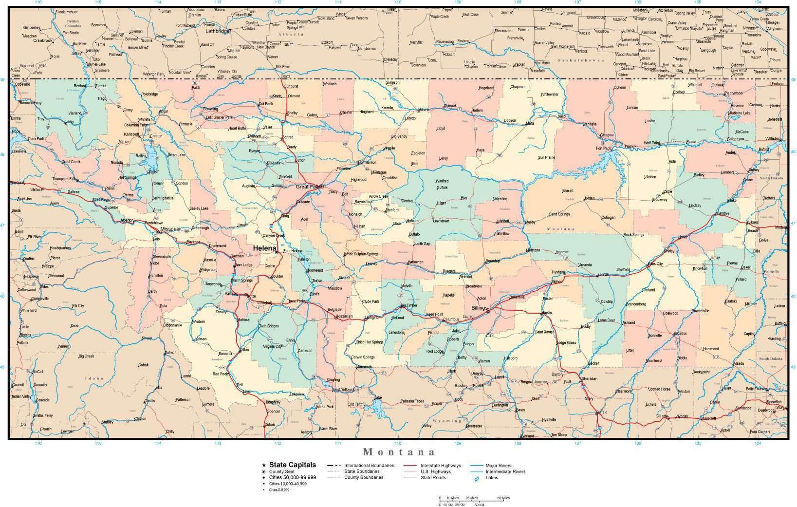 Multi Color Montana Map with Counties, Capitals, and Major Cities