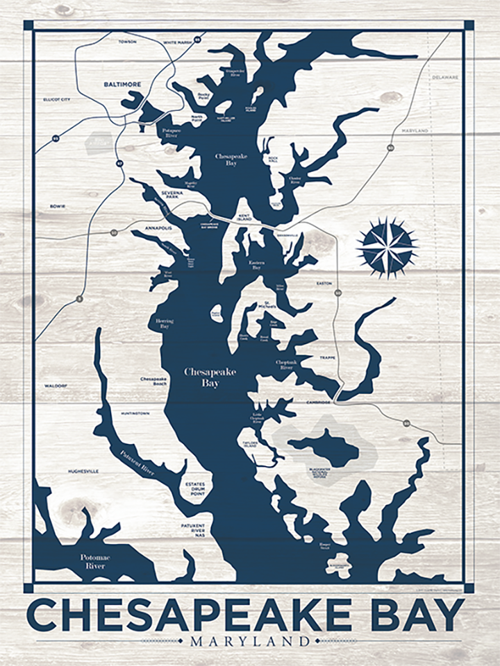 Chesapeake Bay, MD/VA Single Depth Nautical Wood Chart, 11″ x 14″